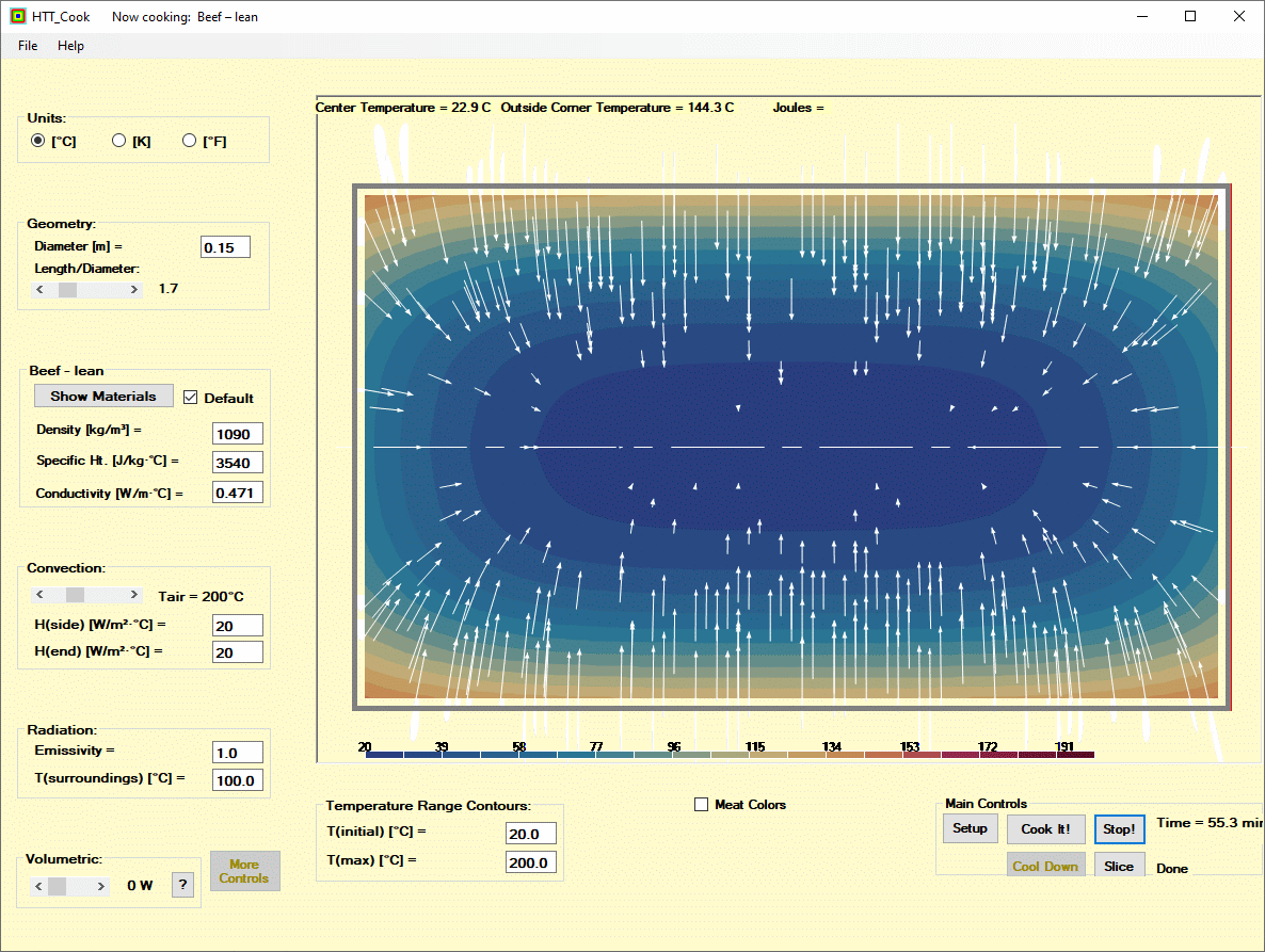 The temperature range expected must be specified by the user as it determines the palette used in the color contour plots. At any point the “chef” can turn off the heat and watch the roast cool off. Then he or she can “slice” it to see the temperature distribution at any point along the length.